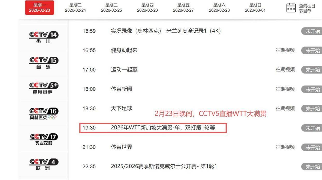 根据最新公布的节目表,中央电视台体育频道CCTV5将于2月23日晚间19点30分,准时开启WTT新加坡大满贯的直播。这一时间点相较于部分观众此前的了解有所推迟,直播内容将重点呈现晚间时段的女单及混双关键性比赛。