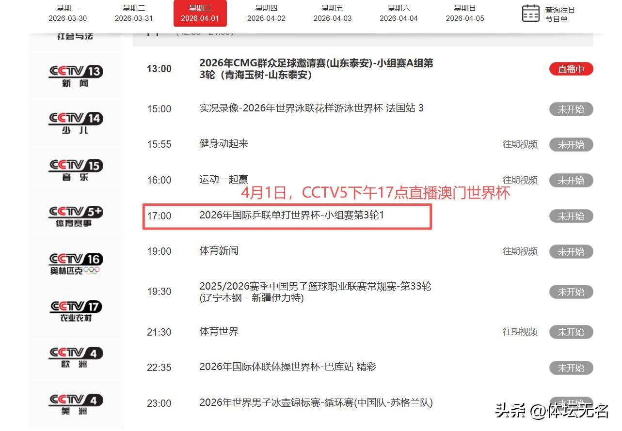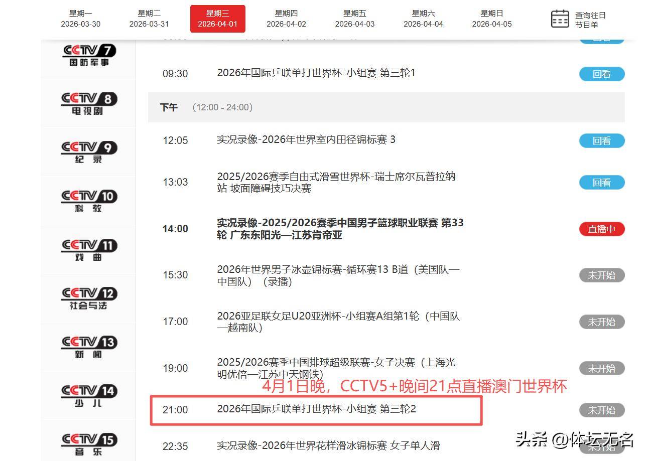 调整!4月1日晚直播澳门世界杯有变王楚钦、王曼昱接连出战