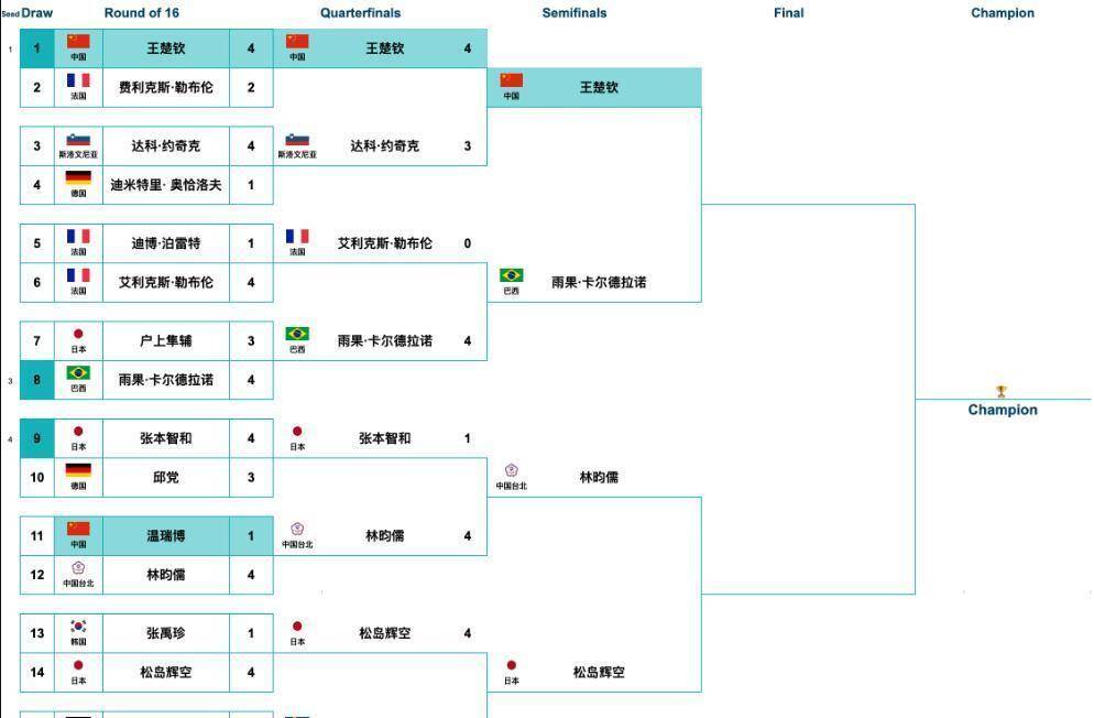 作为本届赛事国乒男队唯一晋级四强的选手,王楚钦独自扛起了争冠重任。 他在四分之一决赛对阵斯洛文尼亚选手达科·约奇克时,在1比3大比分落后的绝境下连扳三局,最终以4比3逆转获胜。 此前八分之一决赛,他同样经历六局苦战,以4比2淘汰法国新星费利克斯·勒布伦。 连续两场逆境翻盘,让王楚钦被媒体称为“逆转之王”。