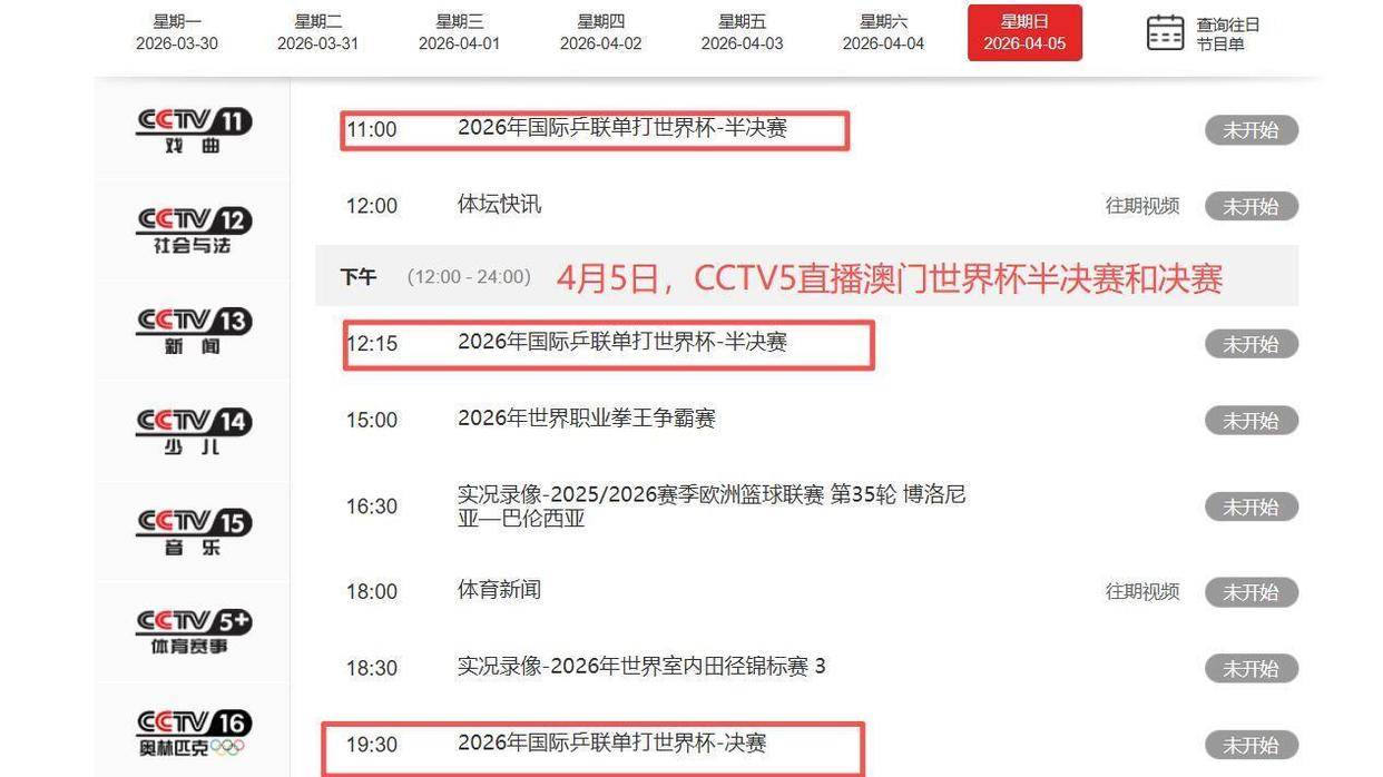 2026-04-06雨燕直播,NBA直播,世界杯直播,足球直播,台球直播,体育直播,世界杯,欧洲杯,苏超直播,村BA直播,苏超联赛,村超,村超直播今天,澳门乒乓球世界杯迎来终极决战日,两枚金牌将在今晚诞生! 国乒三位核心选手孙颖莎、王曼昱、王楚钦全线出击,他们能否顶住外协强敌的轮番冲击,成功包揽男女单打冠军? 央视CCTV5将从上午11点开始全程直播这场乒乓盛宴,你准备好为国乒加油了吗?