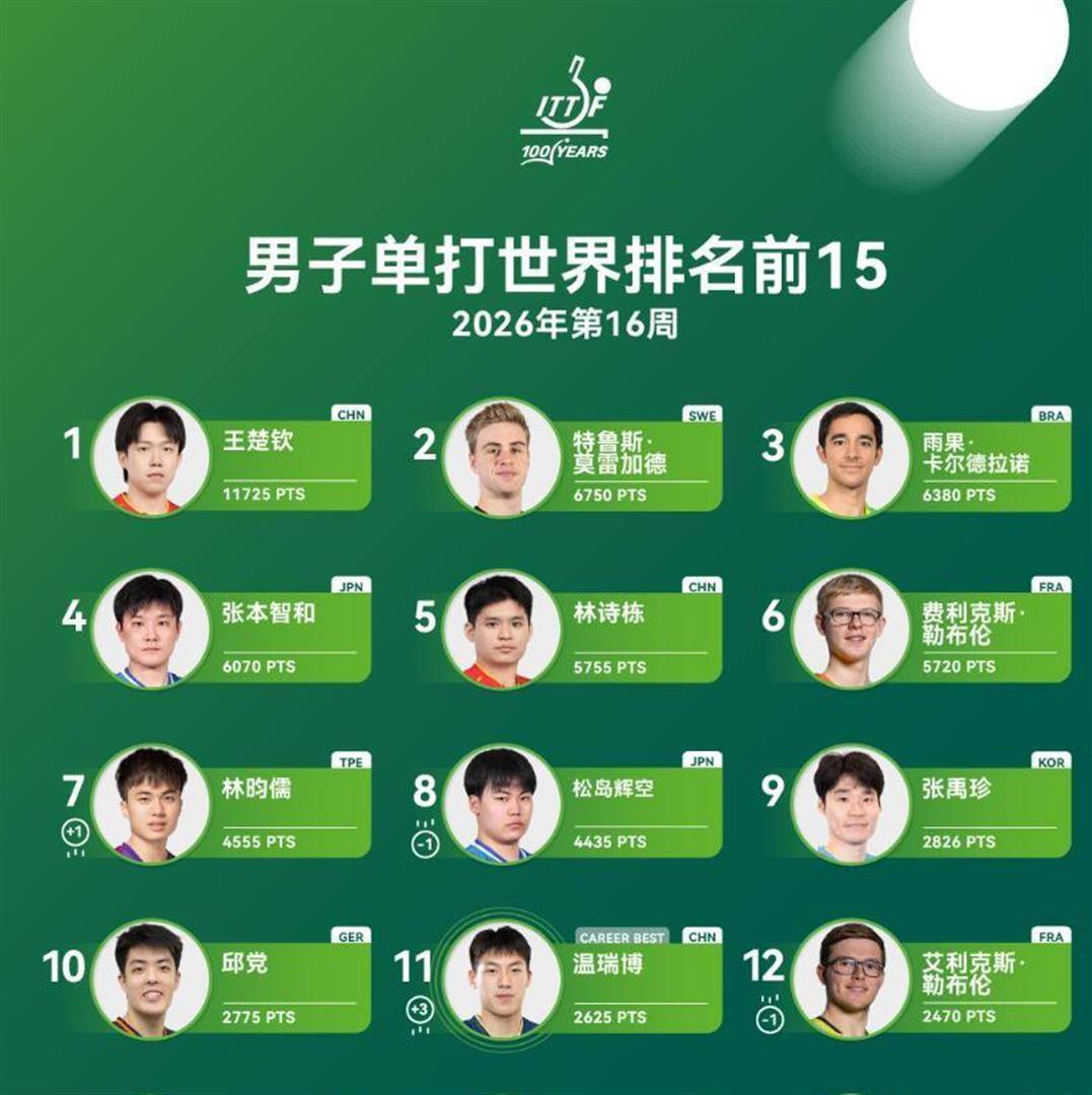 凭借在太原站的出色表现,温瑞博的世界排名也迎来了大幅提升。 国际乒联在4月13日公布了2026年第16周的最新世界排名。 在男子单打榜单上,温瑞博的排名上升了3位,从第14位来到了职业生涯新高的第11位。 这距离世界前十仅一步之遥。 他的决赛对手吉村线位。 而男单世界第一的位置依然毫无悬念,中国选手王楚钦以11725分断层领先,比第二名瑞典的莫雷加德(6750分)高了将近5000分。 另一位中国选手林诗栋位列第五。 一个值得注意的现象是,在男单世界前十的名单里,中国选手只有王楚钦和林诗栋两人。 而老将梁靖崑本周排在第15位。 这与国乒女队形成了鲜明对比。