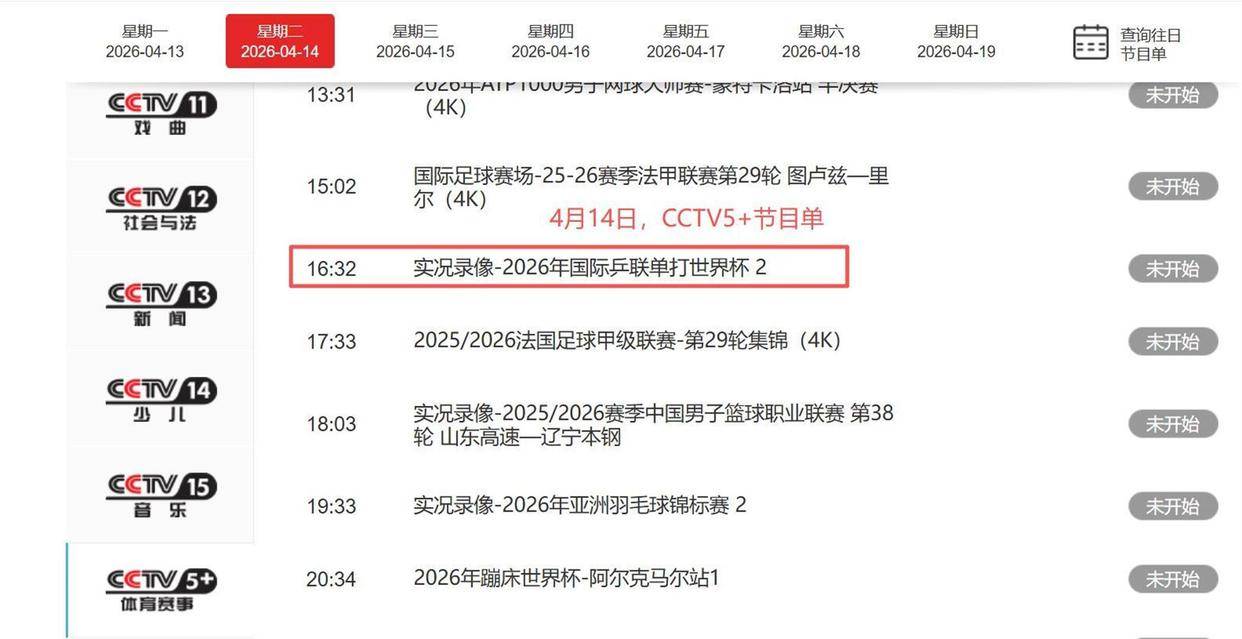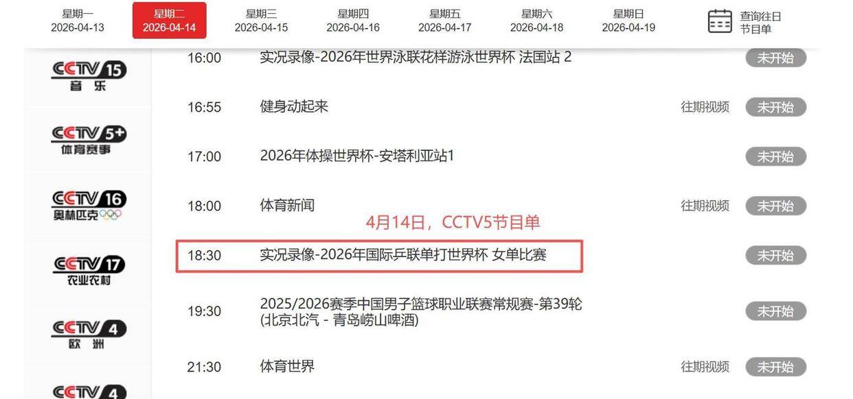 2026-04-16雨燕直播,NBA直播,世界杯直播,足球直播,台球直播,体育直播,世界杯,欧洲杯,苏超直播,村BA直播,苏超联赛,村超,村超直播憋坏了吧,国乒球迷们! 澳门世界杯打完,球队回成都封闭训练,小半个月没正经比赛看,是不是只能刷刷短视频解馋? 别急,好消息来了! 就在今晚,4月14日星期二,晚上18点30分,中央五套CCTV5体育频道,终于排上了国乒的节目! 虽然不是实时直播,但内容绝对够硬——2026年国际乒联单打世界杯的女单比赛实况录像。 这意味着,你可以再次在电视上,完整地欣赏到孙颖莎、王曼昱这些绝对主力的精彩对决,重温她们在澳门赛场上的夺冠之路。
