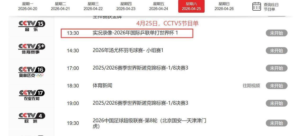 2026-04-30雨燕直播,NBA直播,世界杯直播,足球直播,台球直播,体育直播,世界杯,欧洲杯,苏超直播,村BA直播,苏超联赛,村超,村超直播今晚21点35分,当你打开电视机调到CCTV5频道,会看到一场特别的乒乓球比赛直播。 这不是一场新的对决,而是央视特意为即将出征伦敦世乒赛的中国国家乒乓球队准备的“经典回放”。 在4月20日到26日这几天,央视多个体育频道轮番播出2026年澳门单打世界杯的精彩录像,目的很明确:用国乒队员不久前夺冠的辉煌时刻,为即将踏上卫冕征程的队伍加油打气,也给屏幕前的我们进行一次“战前心理建设”。 就在4月25日这一天,距离伦敦世乒赛开幕仅剩3天,国乒的伦敦时间已经进入倒计时,而央视的这场“回忆杀”安排,是不是在暗示着什么?