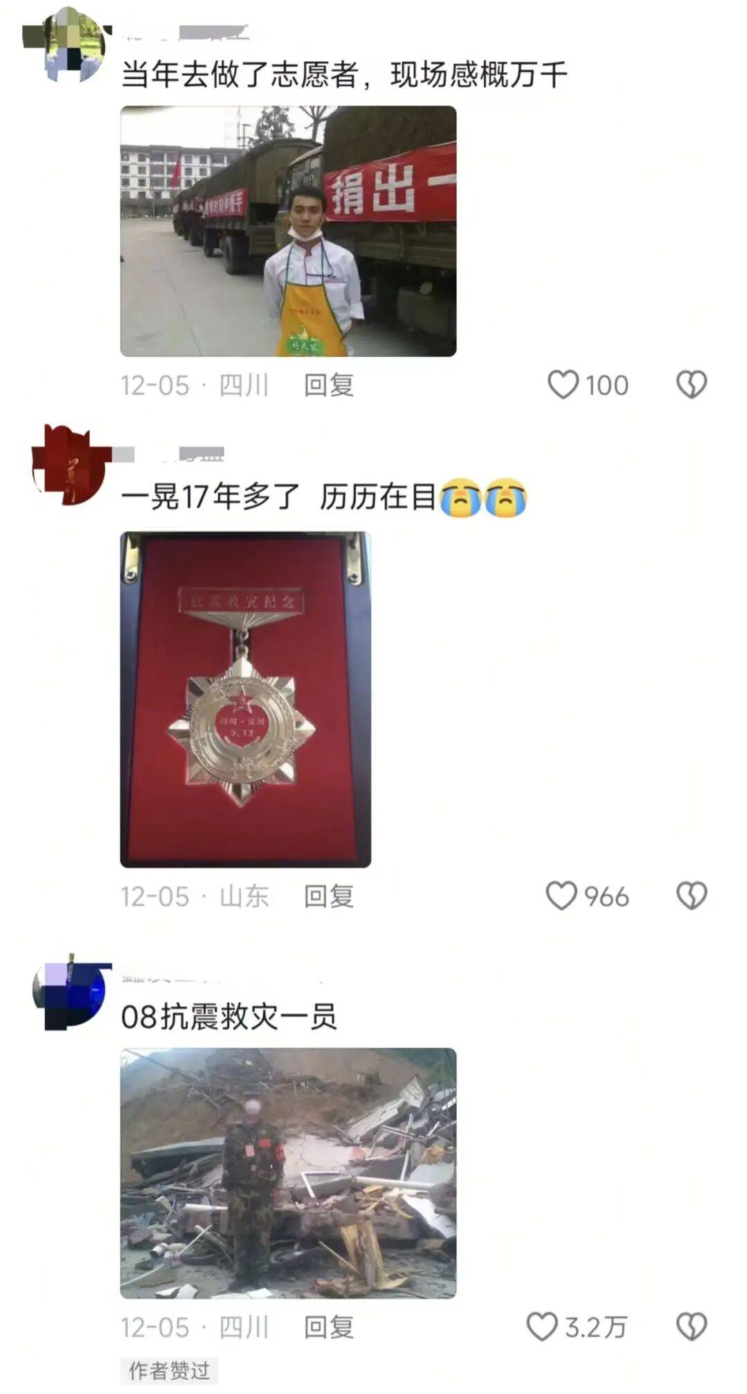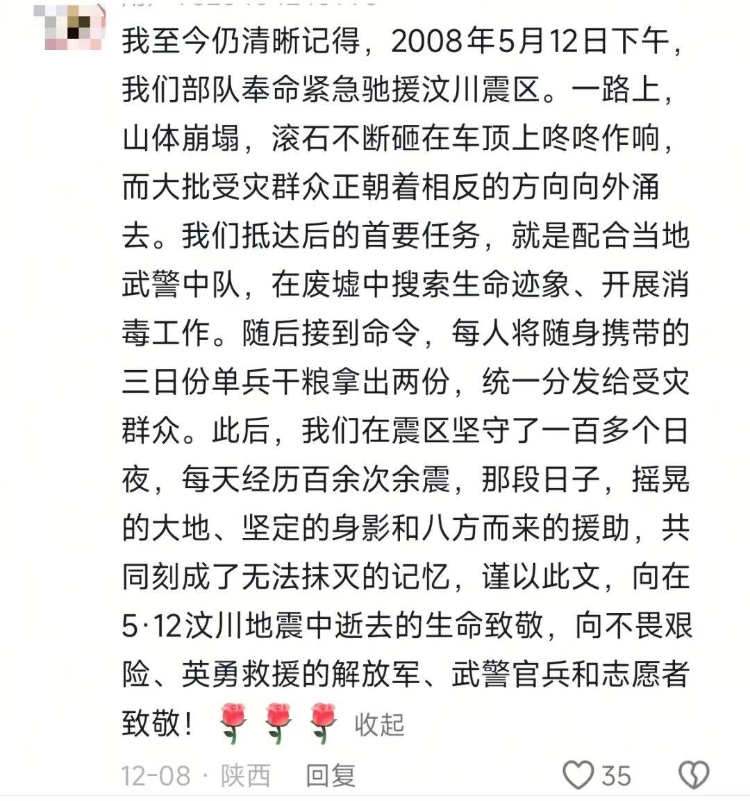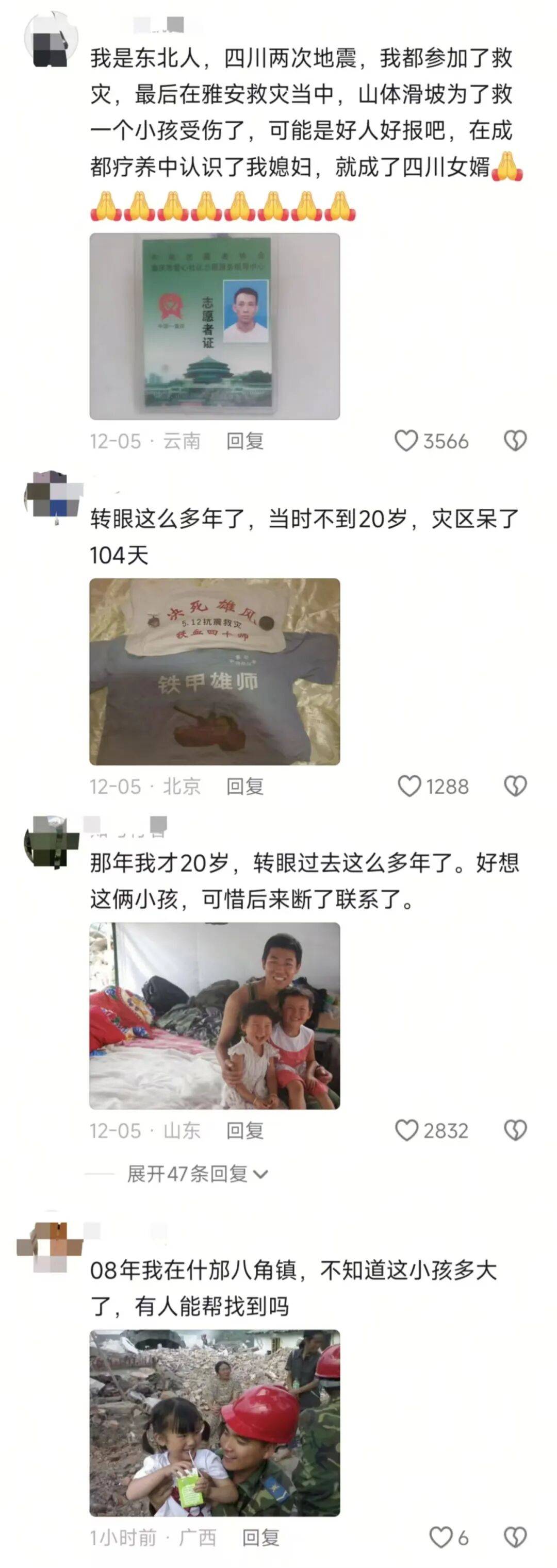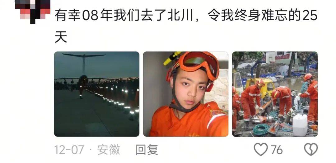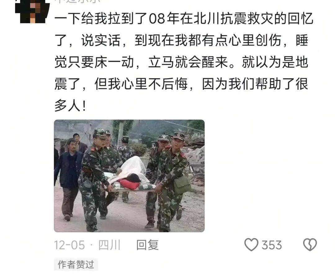 他说,哪怕过去这么多年,只要夜里床一晃,还是会猛然惊醒,下意识以为地震又来了。“有创伤是真的,但我不后悔,”他写道,“因为我们真的帮到了很多人。”