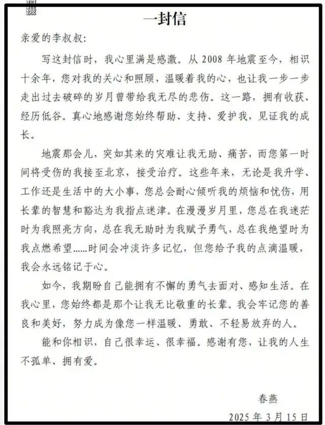 信中,这个如今已成熟坚韧的姑娘,将十余年的感激与成长细细诉说:“地震那会儿,突如其来的灾难让我无助、痛苦,而您第一时间将受伤的我接至北京……这些年来,无论是我工作还是生活中的大小事,您总会耐心倾听……在我心里,您始终都是那个让我无比敬重的长辈。”