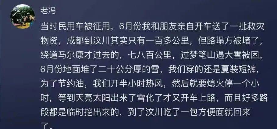 评论区里,一个叫“老冯”的账号留言,说起当年开着自己的货车被征用,从成都到汶川不过百公里,路却断了。他们绕道马尔康,多走出七八百公里。六月的梦笔山,竟下起大雪,地上积了二十公分。他们穿着夏装短裤,为了省油,开半小时暖风就得熄火在严寒里硬扛一小时,直到太阳出来雪化。赶到汶川,卸下物资,只吃了一包泡面,便调头折返。