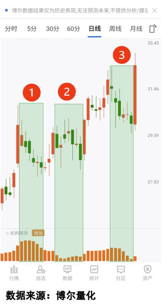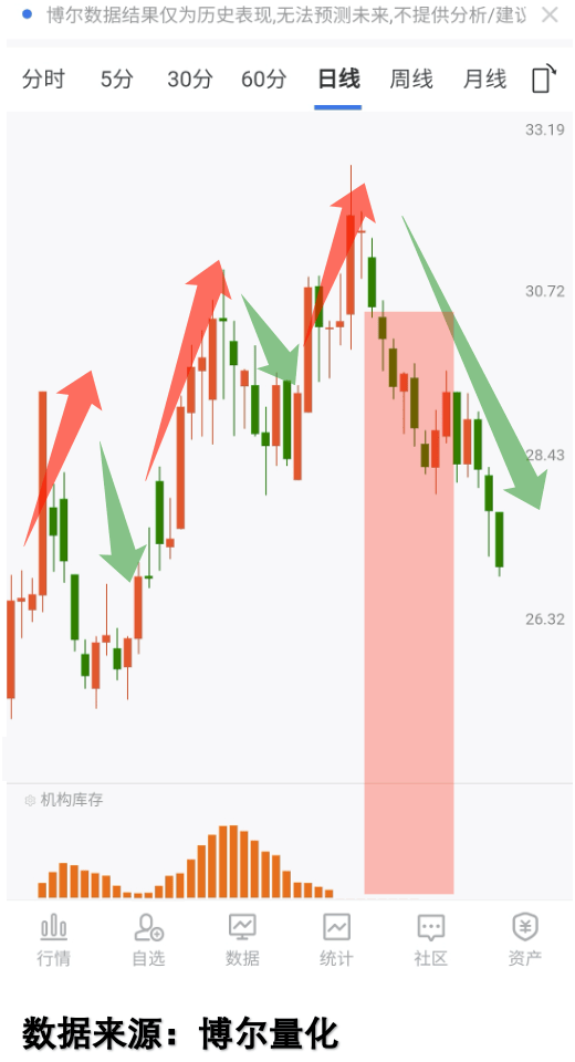 这只股票表面上一路涨,但中间有三个调整区域,幅度都快到20%了。换作以前,他早就在第一个调整区“割肉跑路”了,可这次他没动——因为他看了“机构库存”数据(看图2):
