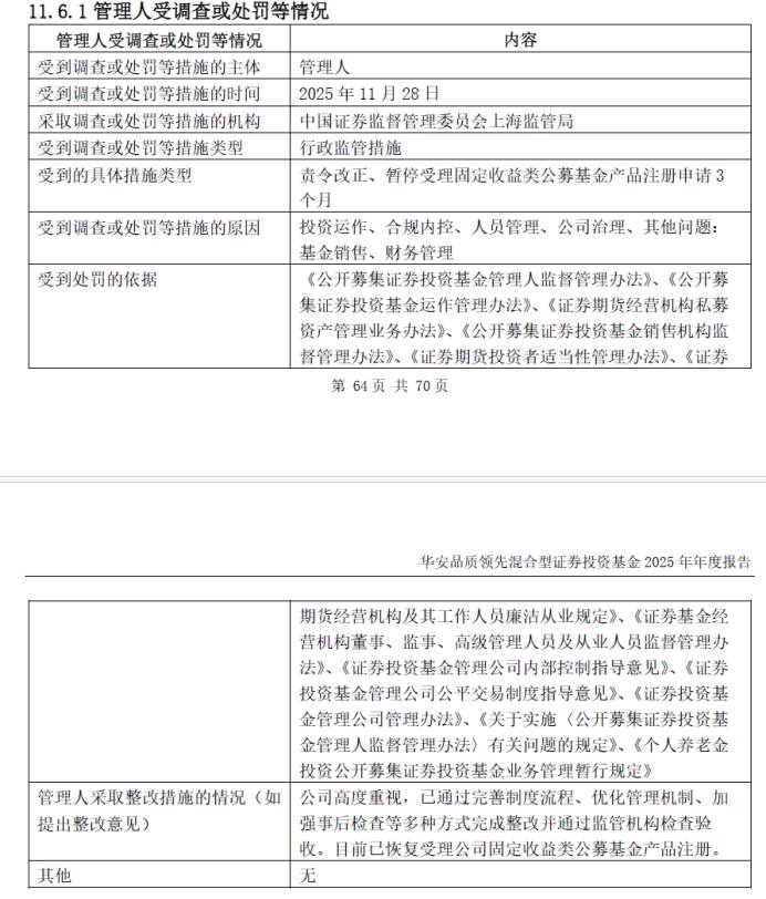 2025年11月28日,华安基金被中国证监会上海监管局责令改正、暂停受理固定收益类公募基金产品注册申请3个月。其违规问题涉及投资运作、合规内控、人员管理、公司治理、基金销售及财务管理等多个环节。